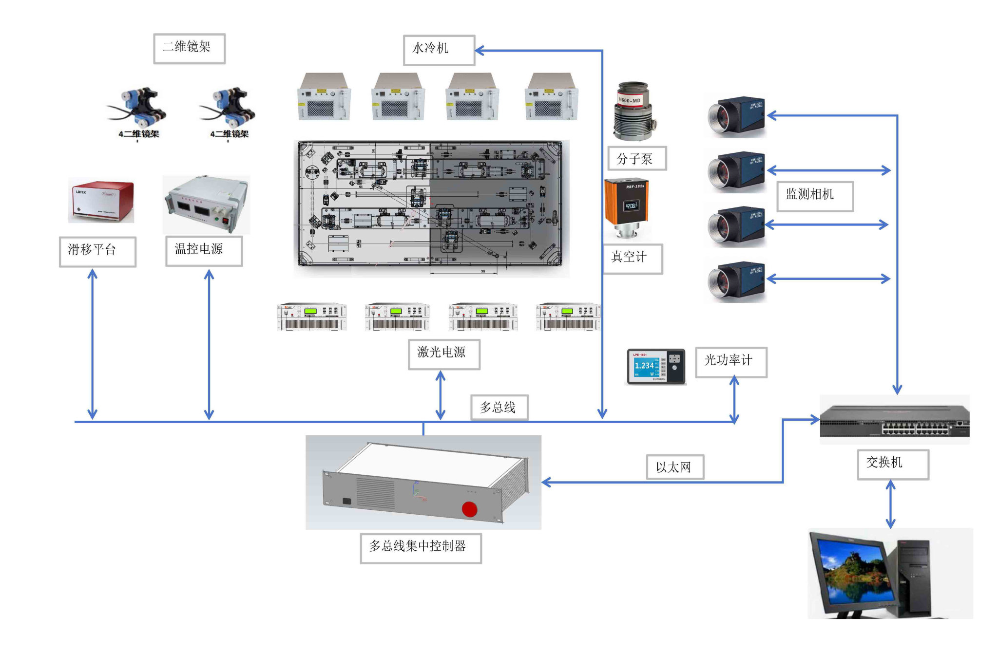 皮秒激光控制系统集成方案主要包括现场监视测量设备数据采集管理功能、各设备参数配置功能、运行状态的实时监测及显示功能、现场监视测量设备及电源设备一体化集成控制功能等。其中现场监视测量设备及电源设备主要包括种子源恒流电源、半导体激光器恒流电源、侧泵直流电源、同步控制设备、温控设备、电机控制设备、能量计、光功率计、光斑监测CCD相机以及真空泵等。