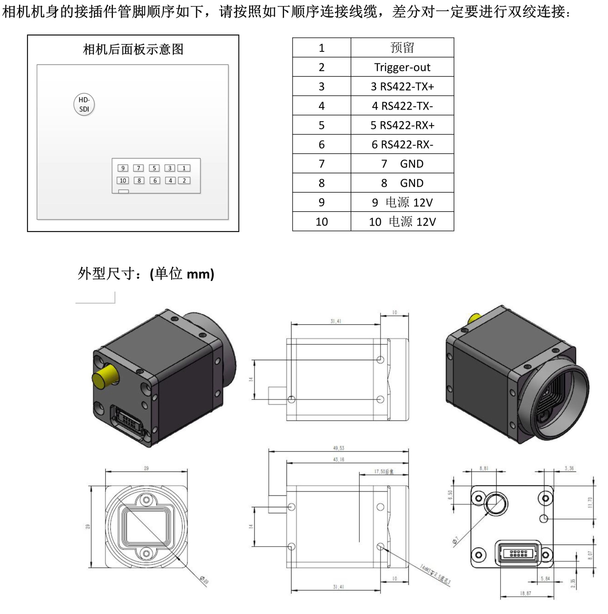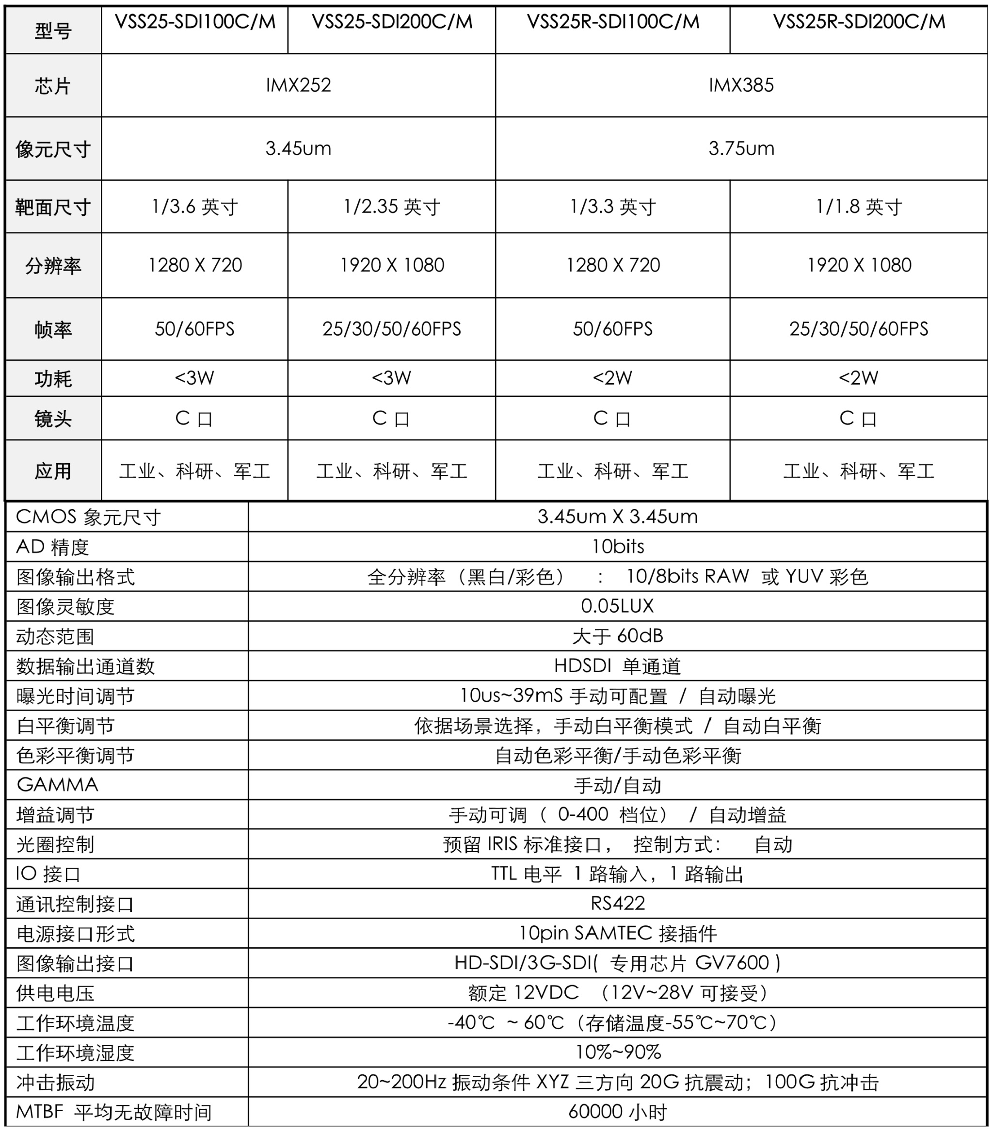 VSS25-SDI 系列彩色(黑白)相机,支持SONY 公司全局快门系列CMOS 芯片,象元尺寸3.45um,分辨率有300W/500W 共2 种,色彩分为:黑白、彩色。接口形式为HD-SDI 接口。该系列共有2 款产品可供选择。