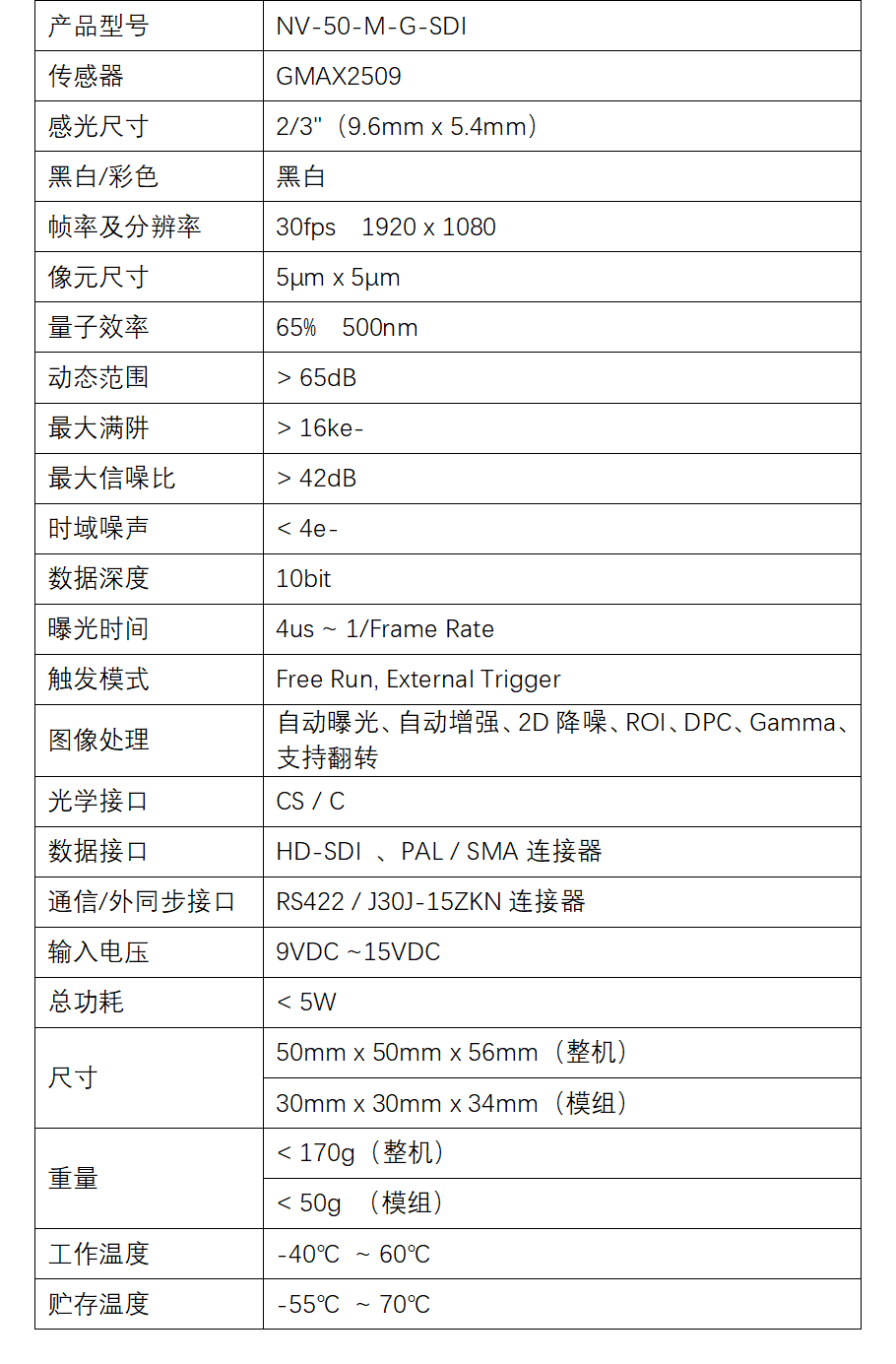 低照度摄像机模组(型号:NV-50-M-G-SDI)是设计采用国产低照度全局快门CMOS相机,产品最大功耗5W,适用于暗弱动目标侦查、监控,照度可低至0.01lux~0.001lux,SDI接口,全国产化设计。